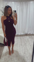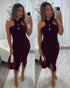 This figure-flattering bodycon midi dress features a ribbed knit fabric that hugs your curves perfectly. The halter neckline with a cheeky keyhole front and jewel accent adds a touch of sparkle, while the racerback silhouette keeps things playful. A front slit brings just the right amount of flair, letting you move with confidence and style.