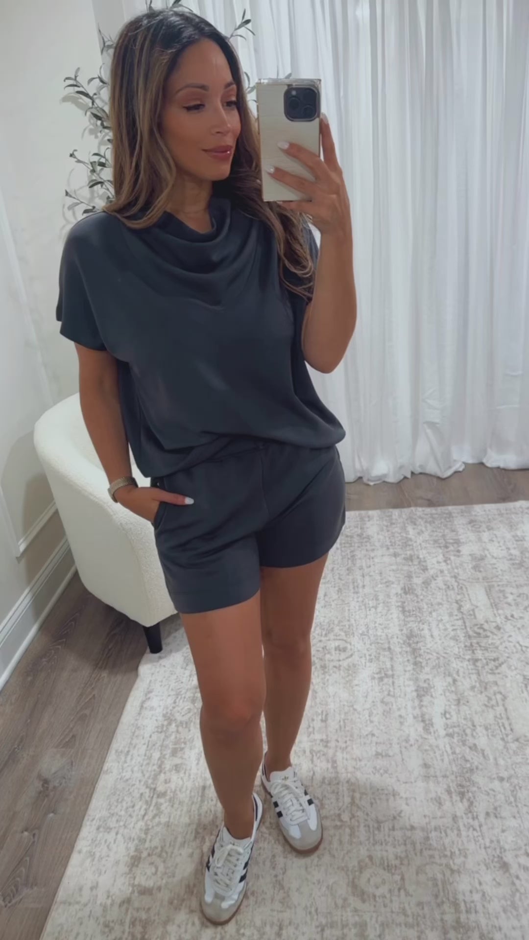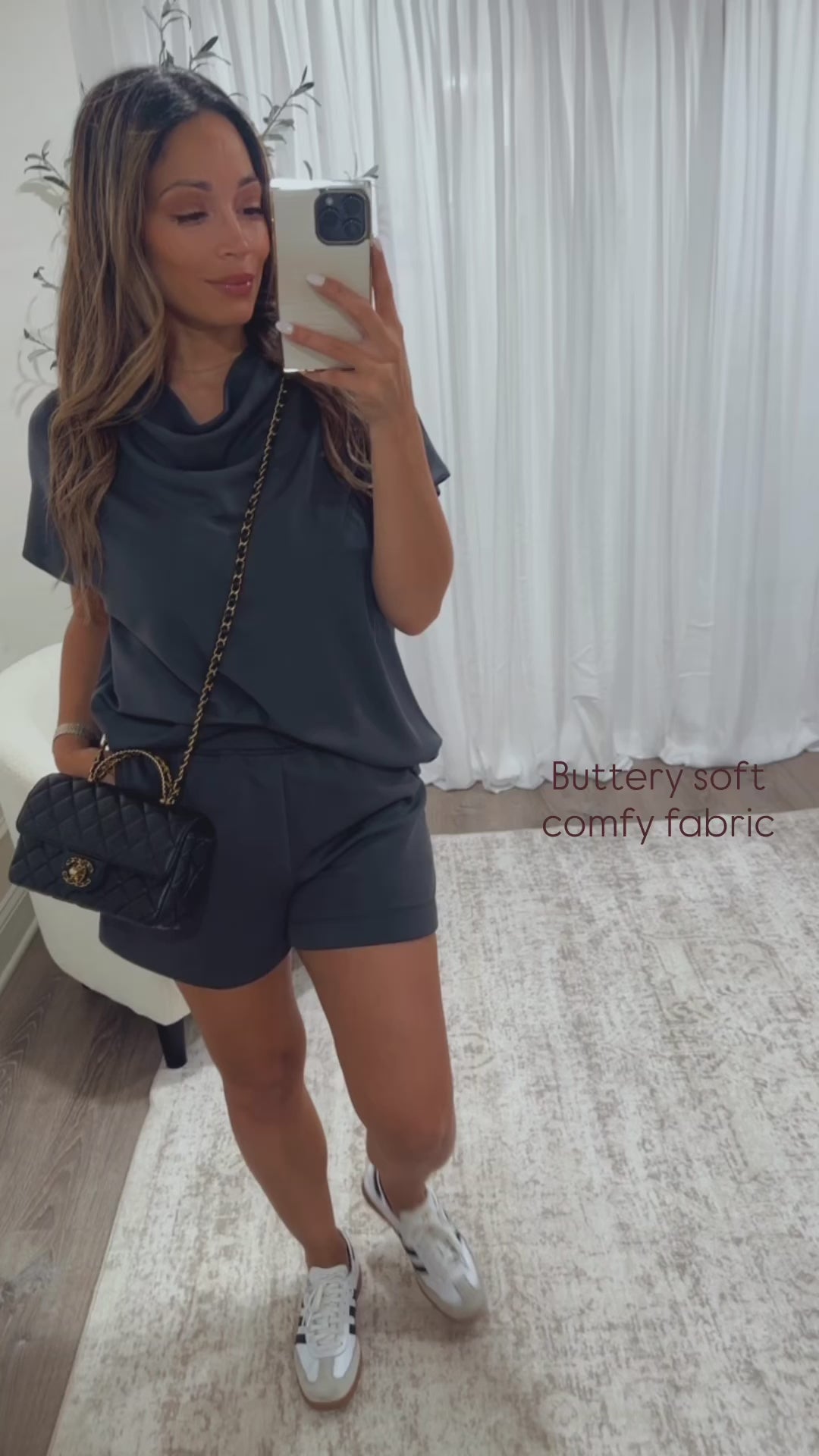 Enjoy cozy vibes with our Cold Brew Scuba Lounge Set. The set includes shorts featuring an elastic waistband for a snug, comfy fit and a relaxed cut ideal for kicking back. Complete the look with the matching cowl neck top for effortless style during your downtime. Perfect for lounging in comfort with a playful touch!