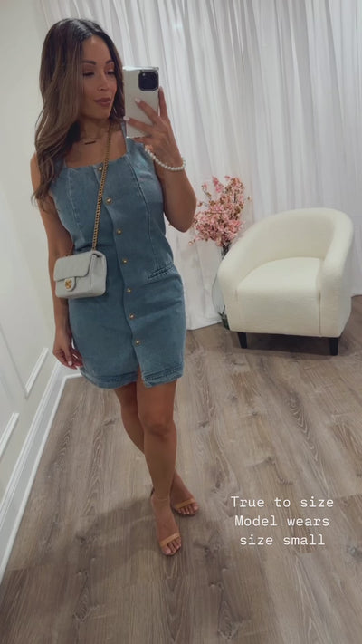 Introducing our Out to brunch Denim Mini Dress! This favorite features denim square neck sleeveless mini dress featuring accented front button closure.