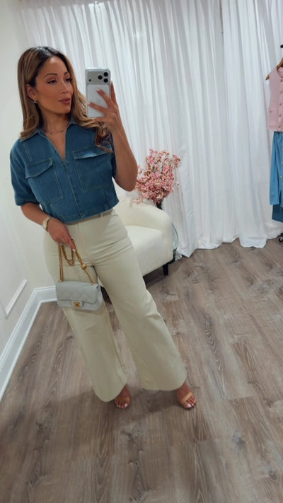 Effortlessly chic and endlessly versatile, this denim V-neck cropped top is your new wardrobe essential. The flattering neckline and cropped silhouette work beautifully with high-waisted jeans, midi skirts, or tailored trousers—dress it up for brunch or keep it casual for everyday wear. Timeless denim construction meets modern styling for a piece you'll reach for again and again.