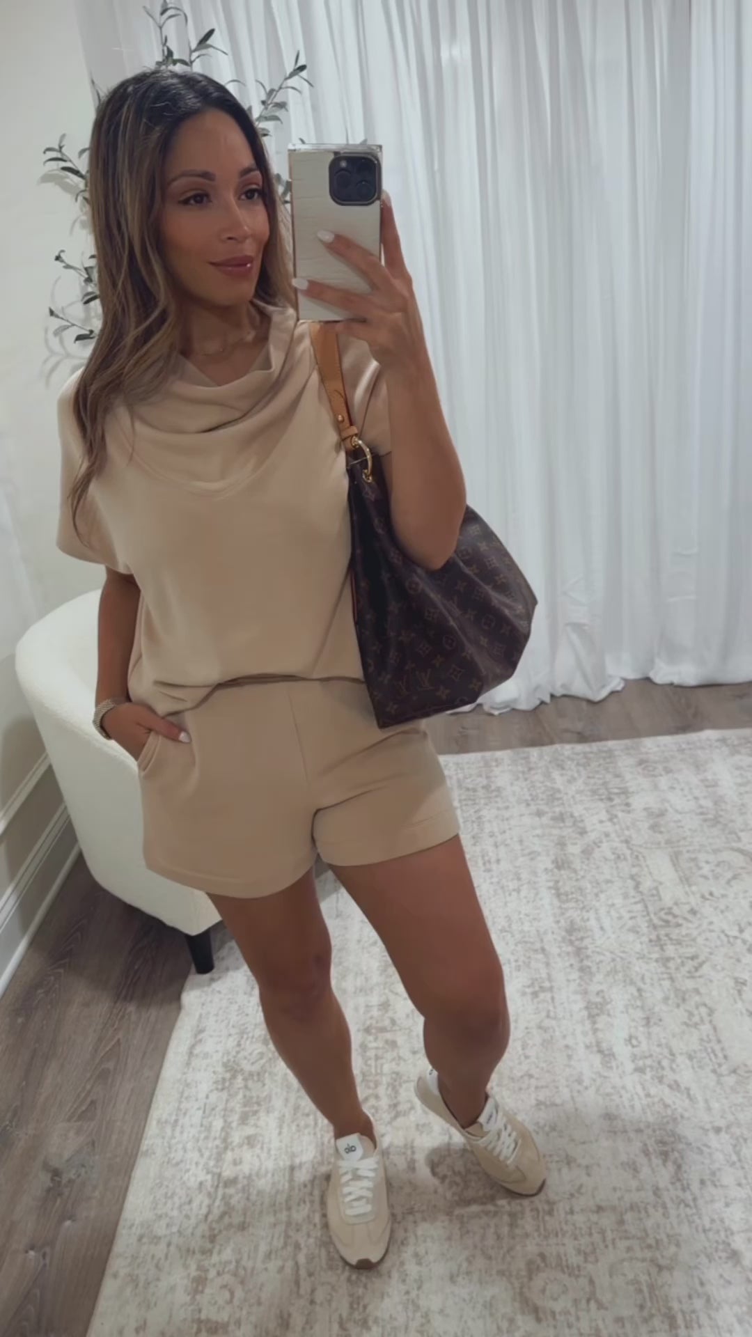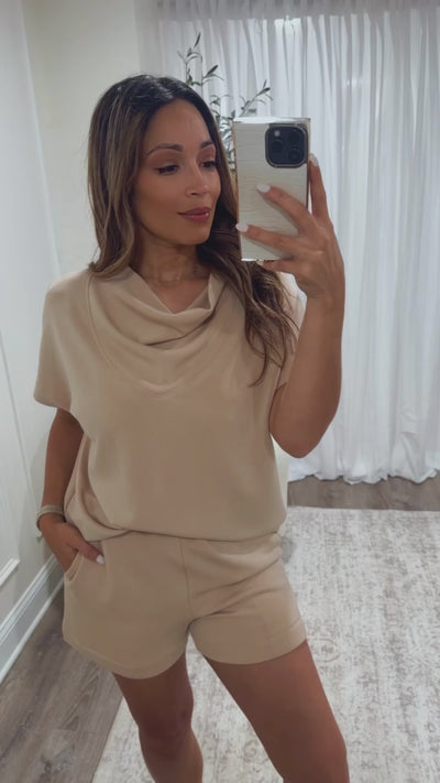 Enjoy cozy vibes with our Cold Brew Scuba Lounge Set. The set includes shorts featuring an elastic waistband for a snug, comfy fit and a relaxed cut ideal for kicking back. Complete the look with the matching cowl neck top for effortless style during your downtime. Perfect for lounging in comfort with a playful touch!