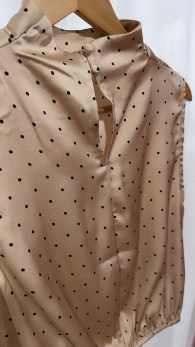 Effortless spring elegance meets playful polish with this coordinating set. The high-neck sleeveless top features a charming dot pattern that pairs seamlessly with the matching midi skirt, cinched at the waist with an elastic band for a flattering, comfortable fit. Whether you're heading to a graduation party, brunch, or casual event, this duo delivers chic versatility without the fuss. Mix, match, or wear together—either way, you're ready to shine.