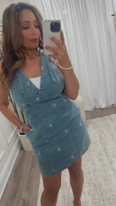 This playful mini dress features a retro-inspired daisy embroidery that adds a charming touch to its classic denim fabric. The flattering V-neckline and breezy cut make it the perfect little summer dress to brighten your day and keep you comfortable all season long. (Layering white top not included)