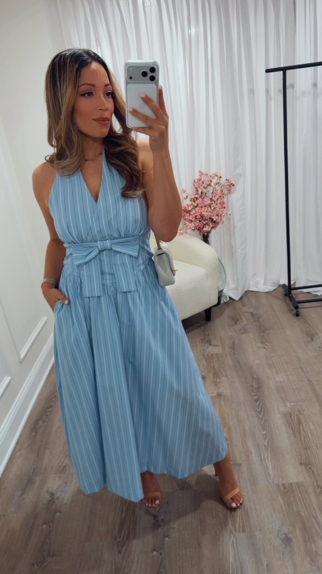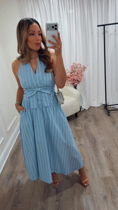Elevate your spring and summer wardrobe with this striking Stripe Halter Midi Dress, designed for effortless sophistication. The flattering halter neckline and graceful midi length create a polished silhouette, while the charming bow detail adds a feminine touch. Versatile enough for garden parties, weddings, or evening gatherings, this piece transitions seamlessly from day to night. The classic stripe pattern ensures timeless appeal season after season. A wardrobe essential that delivers both style and versatility.