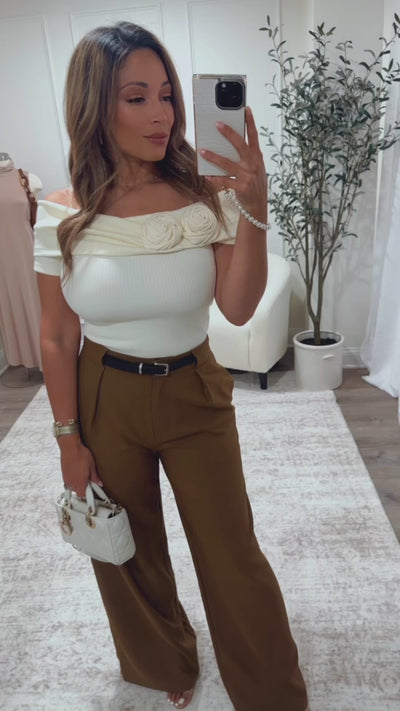 This off-shoulder rib knit top with charming flower detail is your go-to for a seamless summer-to-fall look. Soft and comfy, it pairs perfectly with your favorite jeans or pants, adding a flirty touch to any outfit. Embrace the change of seasons in style!