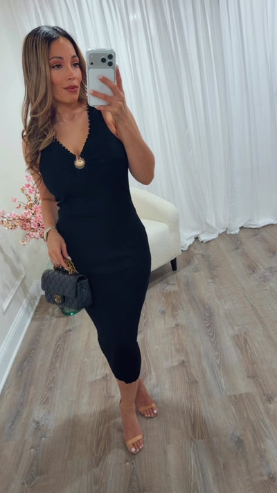 Black ribbed knit midi dress with sleeveless V-neck and gold ring detail at the bust. The figure-hugging silhouette flatters your curves while the stretchy ribbed knit fabric ensures comfort and ease of movement. Versatile enough for casual outings or elevated evening occasions, this dress transitions seamlessly from day to night. A modern essential that combines sophisticated style with wearable elegance.