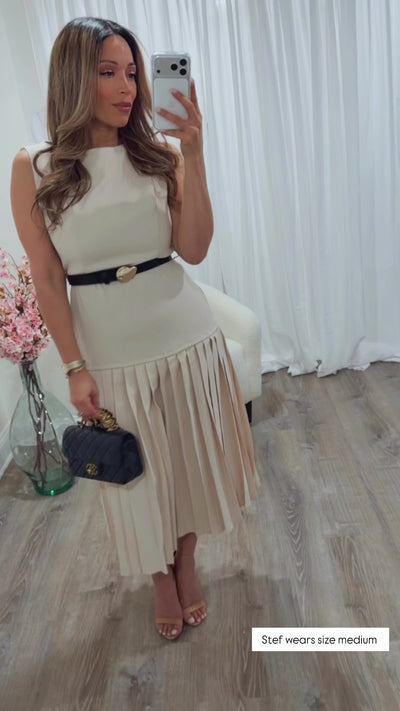 Elevate your event wardrobe with this sophisticated belted sleeveless midi dress. The flattering silhouette features a defined waist and graceful pleated contrast detail that adds visual interest and movement. Perfect for graduations, weddings, spring brunches, and summer celebrations, this versatile piece transitions seamlessly from day events to evening occasions. The midi length offers timeless elegance while the sleeveless design keeps you cool and comfortable.