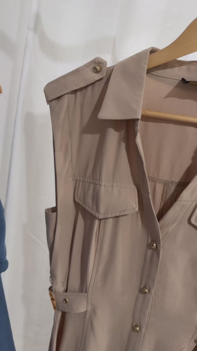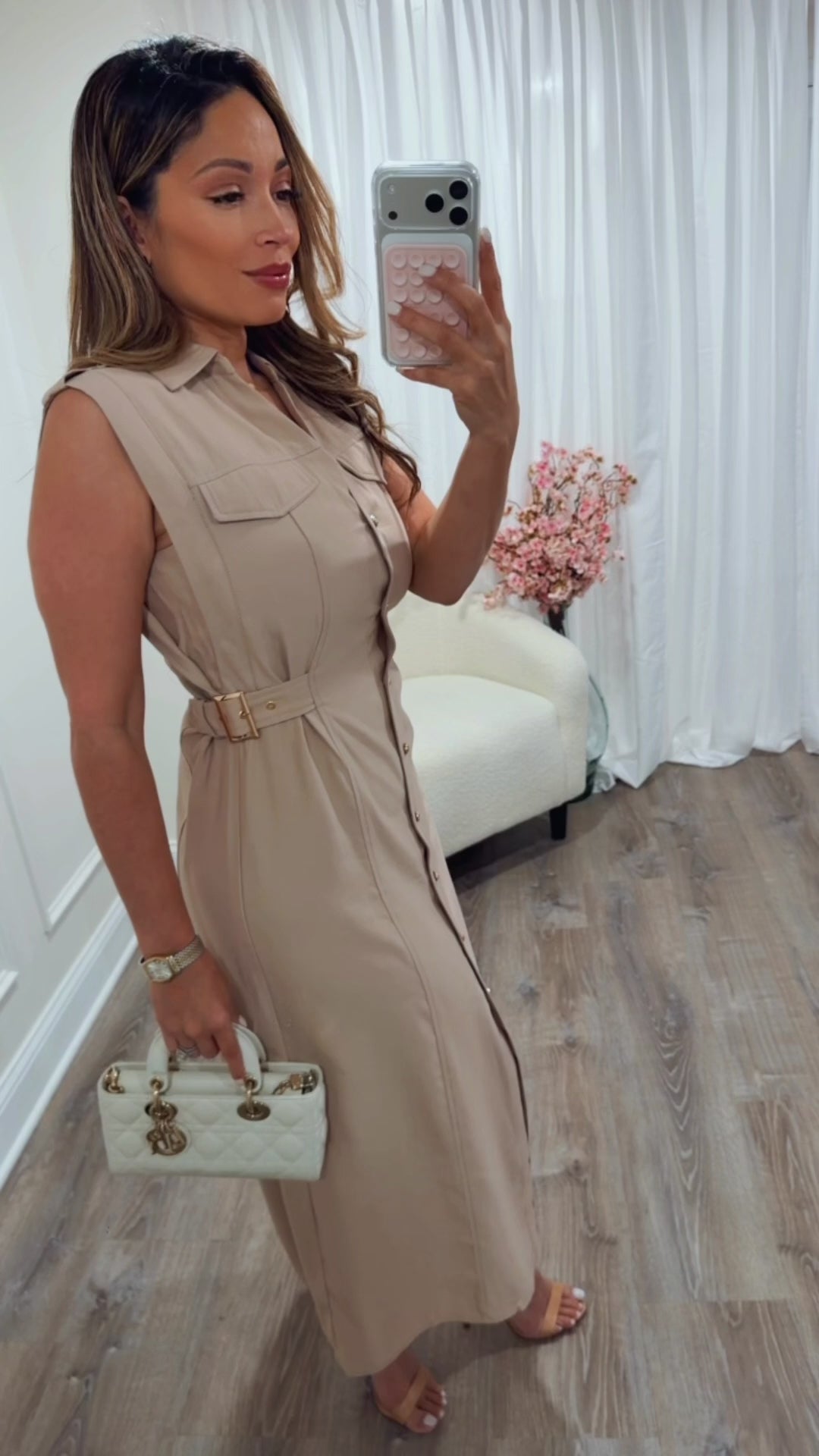 Effortless elegance meets spring romance in this sleeveless midi dress. The structured waist buckle cinches your silhouette while gold buttons add a touch of polish—whether you're heading to lunch, a casual date, or anywhere in between. Versatile enough for day-to-night transitions, this piece pairs beautifully with sneakers or heels depending on your mood. A wardrobe essential that works as hard as you do.